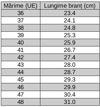 • Alege mărimea în funcție de lungimea piciorului cel mai mare.
